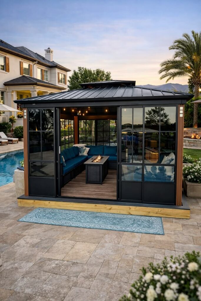 Moreover, fire pits surrounded by tempered glass add warmth without compromising sightlines. This modern twist keeps flames visible while ensuring safety for guests nearby.